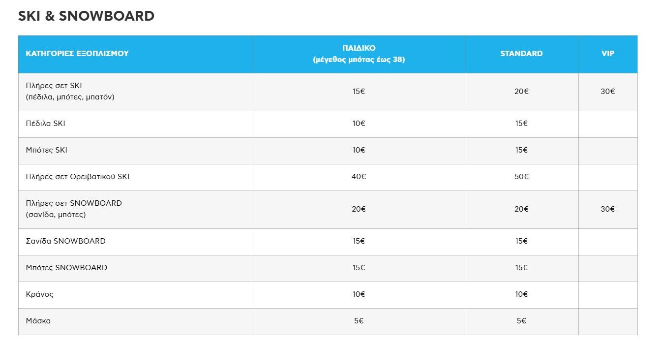 Το ΧΚ Anilio Park παρέχει τη δυνατότητα ενοικίασης εξοπλισμού για τα αθλήματα της χιονοδρομίας στο Τμήμα Ενοικίασης Εξοπλισμού που βρίσκεται στη βάση, στο Τμήμα Έκδοσης Εισιτηρίων, δίπλα από το Petit Chalet-Snowbar, με τις ακόλουθες τιμές: