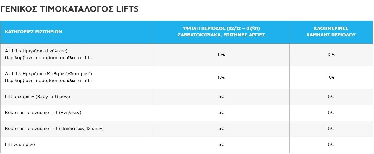 - Μετά την έκδοση του εισιτηρίου ουδεμία έκπτωση παρέχεται, ή επιστροφή χρημάτων, ανεξαρτήτως καιρικών συνθηκών και λειτουργίας αναβατήρων.