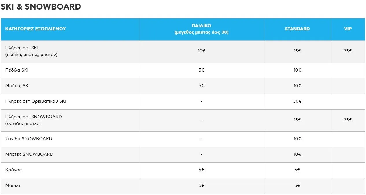 Το ΧΚ Anilio Park παρέχει τη δυνατότητα ενοικίασης εξοπλισμού για τα αθλήματα της χιονοδρομίας στο Τμήμα Ενοικίασης Εξοπλισμού που βρίσκεται στη βάση, στο Τμήμα Έκδοσης Εισιτηρίων, δίπλα από το Petit Chalet-Snowbar, με τις ακόλουθες τιμές: