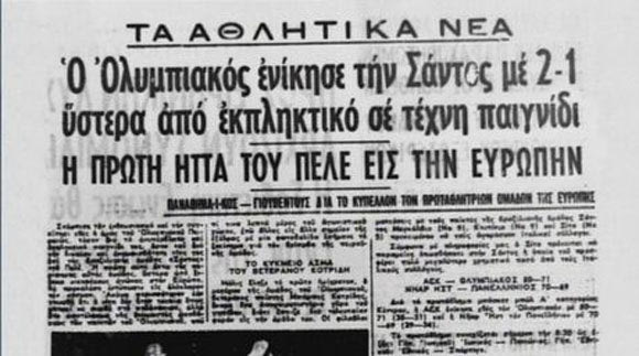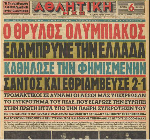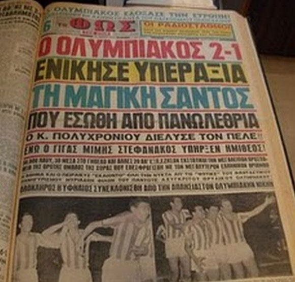 Μια νίκη – σταθμός για την ιστορία του Ολυμπιακού, την ιστορία του ελληνικού ποδοσφαίρου. “Ο ΟΛΥΜΠΙΑΚΟΣ ΕΔΟΞΑΣΕ ΤΗΝ ΕΥΡΩΠΗ. ΕΝΙΚΗΣΕ 2-1 ΥΠΕΡΑΞΙΑ ΤΗ ΜΑΓΙΚΗ ΣΑΝΤΟΣ, ΠΟΥ ΕΣΩΘΗ ΑΠΟ ΠΑΝΩΛΕΘΡΙΑ. Ο ΠΟΛΥΧΡΟΝΙΟΥ ΔΙΕΛΥΣΕ ΤΟΝ ΠΕΛΕ, ΕΝΩ Ο ΓΙΓΑΣ ΜΙΜΗΣ ΣΤΕΦΑΝΑΚΟΣ ΥΠΗΡΞΕΝ ΗΜΙΘΕΟΣ”, έγραφε με τεράστια γράμματα στην πρώτη του σελίδα το “ΦΩΣ” την επομένη του θριάμβου για τη νίκη, που αποτέλεσε πηγή έμπνευσης για τους ρεμπέτες της εποχής, Στράτο Παγιουμτζή και Μαρίνο Γαβριήλ. “Ολυμπιακέ μεγάλε, Ολυμπιακέ τρανέ, που εσάρωσες τη Σάντος, την ομάδα του Πελέ”, ακουγόταν για μέρες σε όλη την Ελλάδα μέχρι που η νίκη έγινε Υμνος (σ.σ. “Ακόμα σε θυμούνται η Σάντος κι ο Πελέ”)