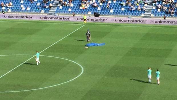 Οι άνδρες ασφαλείας μετέφεραν εκτός γηπέδου τον άνδρα, μαζί και το αλεξίπτωτό του. Συμβαίνουν κι αυτά…