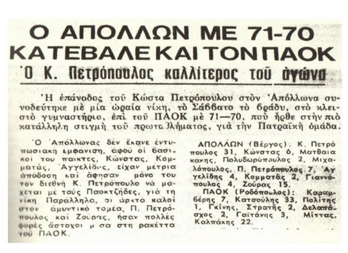 Το επόμενο θρίλερ παίχθηκε τη σεζόν 1980-81, όταν οι Πατρινοί έριξαν στο κανναβάτσο τους Θεσσαλονικείς με 71-70, χοροστατούντος του Κώστα Πετρόπουλου, ο οποίος επανέκαμψε μετά από απουσία λόγω τραυματισμού και σκόραρε 31 πόντους σε ένα two-man show απέναντι στον Μάνθο Κατσούλη (33).