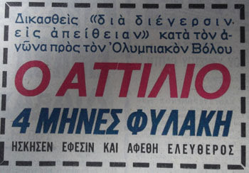 Ο Ολυμπιακός του μεγάλου Νίκου Γουλανδρή, την περίοδο της Χούντας κυνηγήθηκε. Εντός κι εκτός αγωνιστικών χώρων. Μέχρι και τον Αττίλιο… έτρεχαν στα δικαστήρια. Τον Απρίλιο του 1972, μετά το τέλος του αγώνα με τον Ολυμπιακό Βόλου, συνελήφθη και δικάστηκε από το καθεστώς των Συνταγματαρχών «δια διέγερσιν εις απείθειαν»! Αφορμή στάθηκε η παρότρυνσή του (όπως αναφέρεται στα πρακτικά της δίκης) να μην διαλυθεί ο κόσμος, έξω από την θύρα 1 του γηπέδου, όπως διέτασσε η Αστυνομία. Το τριμελές πλημμελειοδικείο Πειραιώς τον καταδίκασε σε 4 μήνες φυλάκιση, με αναστολή. Οι κατηγορίες, όμως δεν στέκονταν. Ο ίδιος άσκησε έφεση και αφέθηκε ελεύθερος. Συνήγορος του Αττίλιο σε εκείνη τη δίκη ήταν ο Ανδρέας Υδραίος, προσωπικός σύμβουλος και δικηγόρος του ευεργέτη του Ολυμπιακού, Νίκου Γουλανδρή.