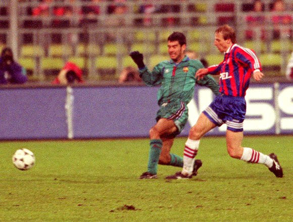 Από το πρώτο παιχνίδι μεταξύ Μπάγερν και Μπαρτσελόνα, στις 2/4/1996 για την προημιτελική φάση του Κυπέλλου UEFA. Οι “μπλαουγκράνα” έχουν σκοράρει στο Μόναχο και πανηγυρίζουν. Τσάπι Φερέρ, Ντε λα Πένια, Τζόρντι Κρόιφ, Ποπέσκου και Ρουτζέ, ενώ παρακολουθεί ο Άνχελ Μουρ