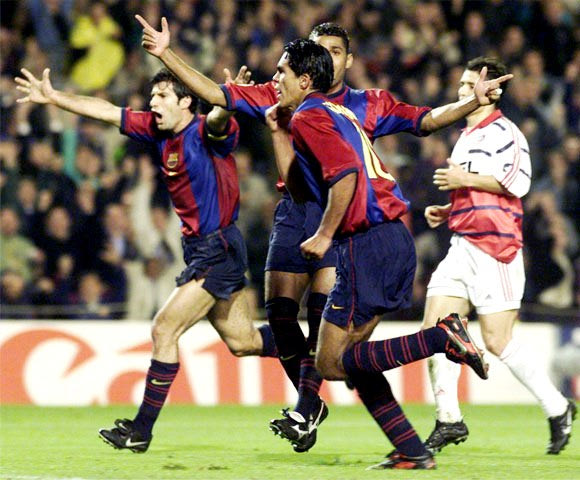 Ο Ζιοβάνι έχει ευστοχήσει στο πέναλτι, η Μπαρτσελόνα έχει ανοίξει το σκορ και μαζί με τον Βραζιλιάνο, πανηγυρίζουν ο Φίγκο και ο Σόνι Άντερσον