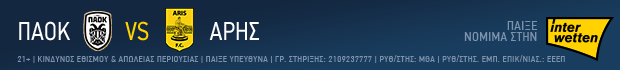 Ο Άρης συνολικά δείχνει κουρασμένος, την περασμένη Τετάρτη ο Ολυμπιακός δεν σκίστηκε όμως η ομάδα του Μάντζιου δεν μπόρεσε να φτάσει στη νίκη. Τέλος η σεζόν για τον Τζέγκο. Ο ΠΑΟΚ αν κερδίσει τον Άρη και την τελευταία αγωνιστική τον Αστέρα εντός εξασφαλίζει μαθηματικά τη δεύτερη θέση. Ο άσος στο 1.73 στην Interwetten.