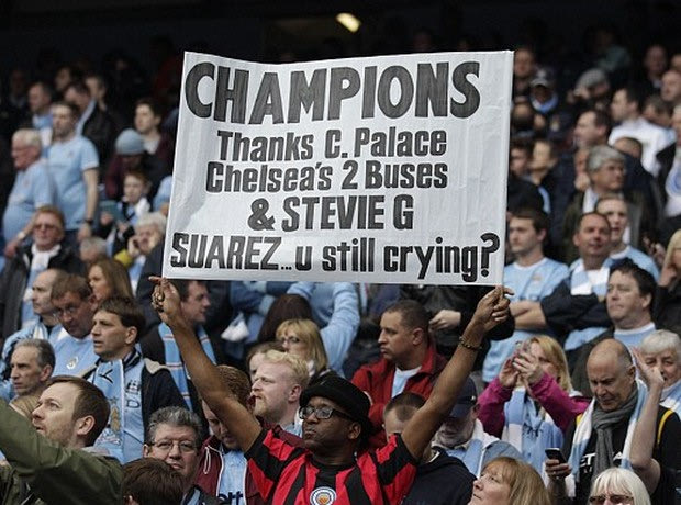 “Πρωταθλητές. Ευχαριστώ την Κρίσταλ Πάλας, τα δύο λεωφορεία της Τσέλσι και τον Στίβεν Τζέραρντ. Σουάρες… κλαις ακόμα;”, έγραφε χαρακτηριστικά περιεχόμενο το πλακάτ .