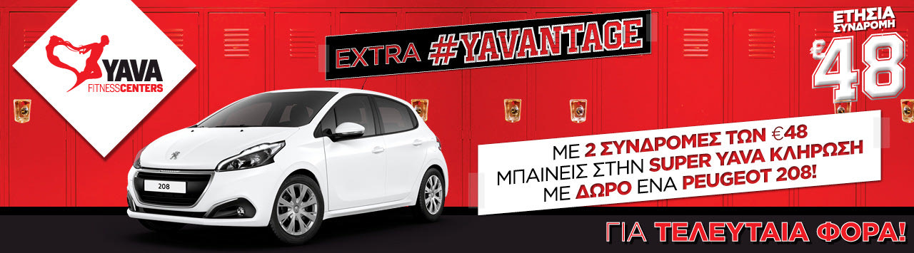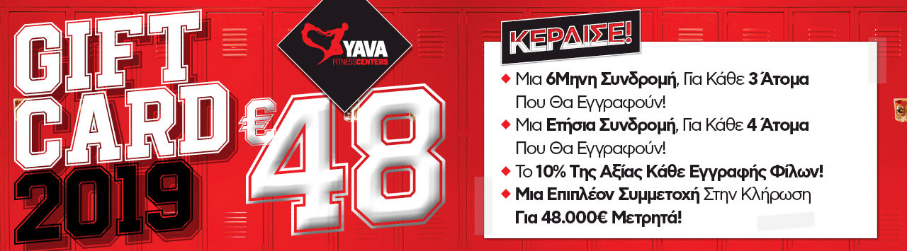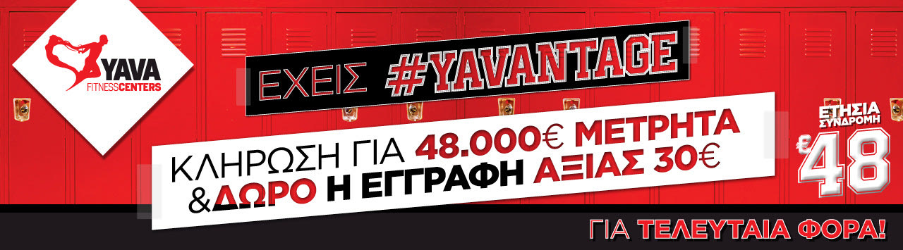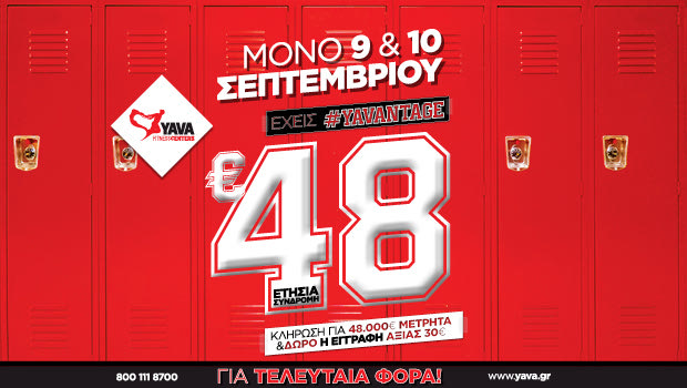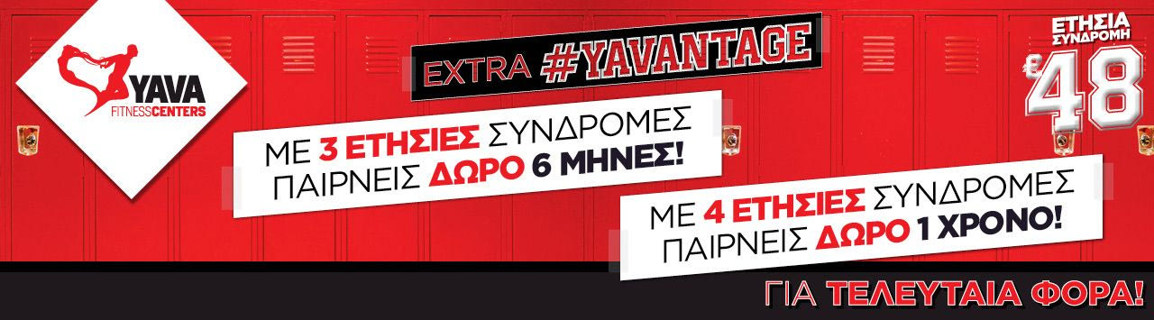 Τα Yava Fitness Centers, ο μεγαλύτερος όμιλος γυμναστηρίων στην Ελλάδα φέρνει και φέτος το Σεπτέμβριο για τελευταία φορά την πιο Value For Money προσφορά της αγοράς. Μέχρι την Τρίτη 10 Σεπτεμβρίου, μπορείς να αποκτήσεις ετήσια συνδρομή γυμναστικής με μόνο 48 ευρώ, για όσα χρόνια θέλεις , κερδίζοντας παράλληλα την εγγραφή σου (αξίας 30 ευρώ), προνομιακές εκπτώσεις σε μοναδικές καινοτόμες υπηρεσίες του δικτύου, επιπλέον δωρεάν ετήσιες συνδρομές, και πολλά – πολλά δώρα !