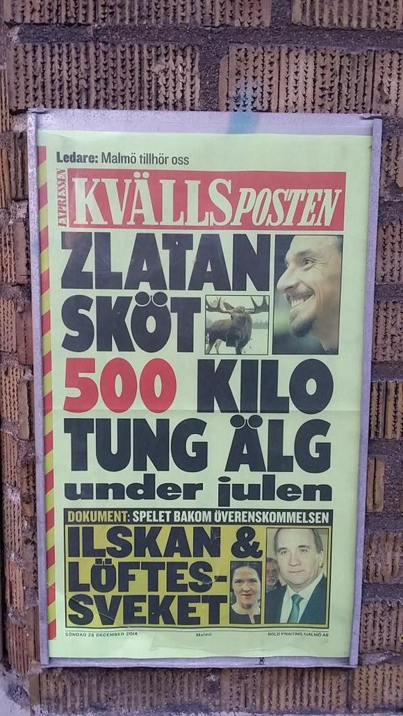 Πρωτοσέλιδο στο σουηδικό Τύπο είναι ξανά ο Ζλάταν Ιμπραχίμοβιτς, αυτή τη φορά γιατί σκότωσε σε κυνήγι μία άλκη βάρους 500 κιλών, με τις φιλοζωικές οργανώσεις να τον έχουν βάλει στο μάτι.