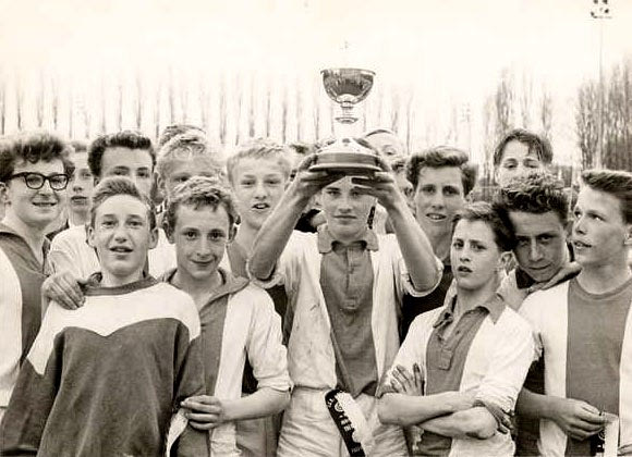 1. Ο Κρόιφ, μπροστά, τέταρτος από αριστερά, ποζάρει μετά την κατάκτηση ενός τροπαίου στις ακαδημίες του Άγιαξ (1959).