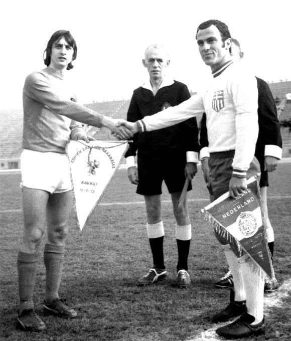 12. Γιόχαν Κρόιφ και Γιώργος Δεληκάρης ανταλλάσσουν λάβαρα πριν την έναρξη του φιλικού αγώνα ανάμεσα σε Ολυμπιακό και Άγιαξ (16/2/1973)