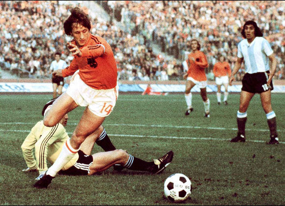 20. Ο Κρόιφ έτοιμος να σκοράρει εναντίον της Αργεντινής στο Μουντιάλ του 1974. Η Ολλανδία είχε διαλύσει σε εκείνον τον αγώνα την “αλμπισελέστε”, κερδίζοντας 4-0 με τον Γιόχαν να πετυχαίνει δυο γκολ (26/6/1974)