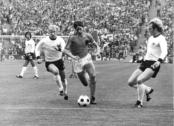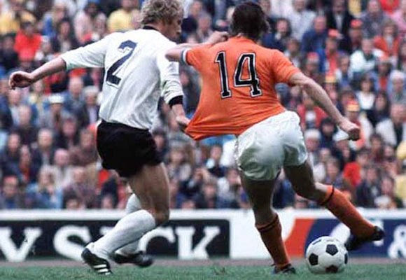 35. Το περίφημο “Cruyff Turn”, η εντυπωσιακή ντρίμπλα που καθιέρωσε ο Ολλανδός σταρ, με την προσποίηση πάσας ή σουτ και την στροφή 180 μοιρών μαζί με τη μπάλα, αποφεύγοντας τον αντίπαλό του. Το “θύμα” εδώ, ο Γερμανός Μπέρτι Φογκτς.