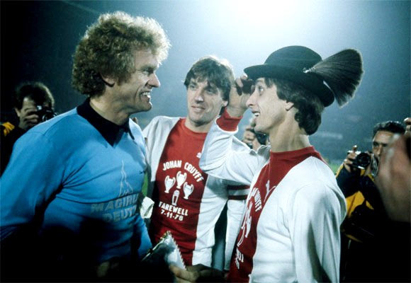 29. Στο φιλικό παιχνίδι προς τιμήν του Κρόιφ που διεξήχθη στις 7 Νοεμβρίου του 1978 ανάμεσα στον Άγιαξ και την Μπάγερν Μονάχου (οι Βαυαροί κέρδισαν 8-1). Στη φωτογραφία ο Γιόχαν αστειεύεται με τον τερματοφύλακα των Γερμανών, Σεπ Μάγιερ.