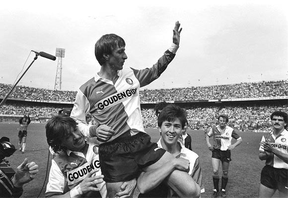 34. Ενώ όλα έδειχναν ότι η καριέρα του είχε φτάσει στο τέλος της, όταν το καλοκαίρι του 1983 ο Άγιαξ δεν του ανανέωσε το συμβόλαιό του, ο Κρόιφ επέλεξε να αγωνιστεί για μια σεζόν (1983/84) στην μεγάλη αντίπαλο του “Αίαντα”, την Φέγενορντ, με την οποία κατέκτησε το νταμπλ (44 συμμετοχές και 13 γκολ), ενώ ψηφίστηκε ως ο κορυφαίος παίκτης του ολλανδικού πρωταθλήματος, ολοκληρώνοντας με θριαμβευτικό τρόπο την ποδοσφαιρική του πορεία μέσα στα γήπεδα.