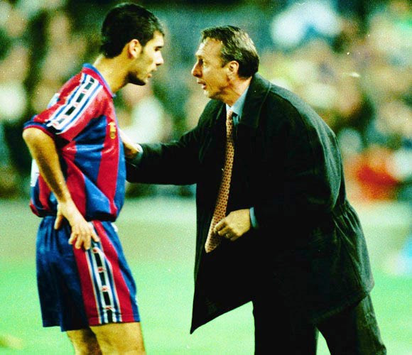 37. Το 1988, ο Κρόιφ ανέλαβε τον πάγκο της Μπαρτσελόνα. Είχε ήδη προπονήσει μια τριετία τον Άγιαξ (1985-1988), κατακτώντας δυο Κύπελλα Ολλανδίας και ένα Κύπελλο Κυπελλούχων Ευρώπης. Στη φωτογραφία τον βλέπουμε μαζί με τον μεγάλο μαθητή του, Πεπ Γουαρδιόλα.
