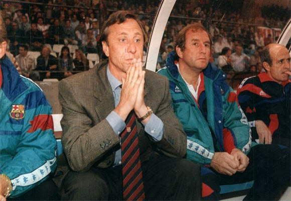 38. Ο Κρόιφ έμεινε 8 χρόνια στην Μπαρτσελόνα (1988-1996). Δημιούργησε την περίφημη “Dream Team”, με την οποία κατέκτησε 4 πρωταθλήματα, 1 Κύπελλο Ισπανίας, 1 Κύπελλο Κυπελλούχων, 1 Κύπελλο Πρωταθλητριών, 3 ισπανικά Σούπερ Καπ και 1 ευρωπαϊκό Σούπερ Καπ. Εδώ, στον πάγκο των “μπλαουγκράνα” μαζί με τον πρώην συμπαίκτη και βοηθό του, Κάρλες Ρεσάκ.