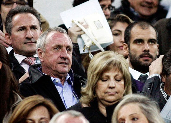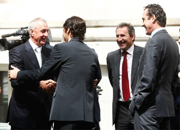 43. Ο Κρόιφ χαιρετάει τον Ραούλ, ενώ παρακολουθούν οι Μπεγκιριστάιν και Βαλντάνο, λίγο πριν την έναρξη του τελικού του Τσάμπιονς Λιγκ του 2010.