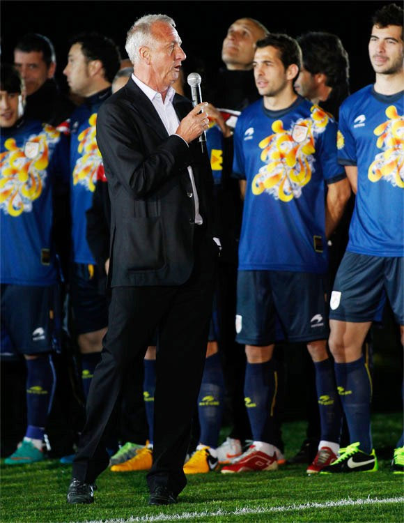 46. Στις 2 Νοεμβρίου του 2009 ο Κρόιφ ανέλαβε τη θέση του εκλέκτορα της Εθνικής ομάδας της Καταλονίας. Παρέμεινε σε αυτό το πόστο μέχρι τον Ιανουάριο του 2013. Εδώ τον βλέπουμε στον τελευταίο του αγώνα στους πάγκους, πριν ξεκινήσει η φιλική αναμέτρηση Καταλονίας και Νιγηρίας (2/1/2013)