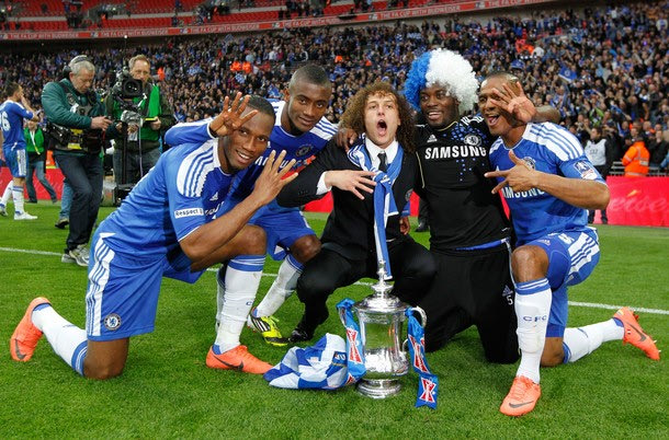 Chelsea players Didier Drogba (L) and Salomon Kalou (2nd L), David Luiz (C), Michael Essien (2nd R) and Florent Malouda (R) celebrate on the pitch after Chelsea's 2-1 win in the FA Cup final football match between Liverpool and Chelsea at Wembley Stadium in London, England on May 5, 2012. AFP PHOTO/IAN KINGTON NOT FOR MARKETING OR ADVERTISING USE / RESTRICTED TO EDITORIAL USE (Photo credit should read IAN KINGTON/AFP/GettyImages)