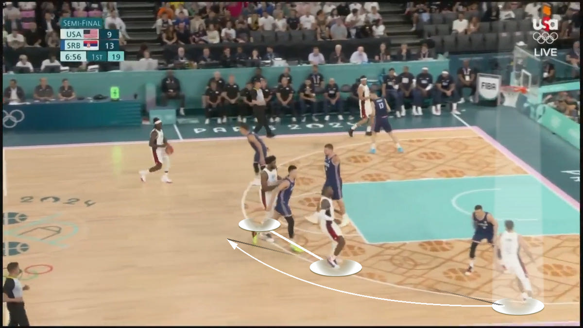 Ο λόγος που έγινε αυτός από τους Σέρβους ήταν διττός: 1. Ήταν δεδομένο ότι με την πίεση των Αμερικανών στην μπάλα δεν θα μπορούσαν να δημιουργήσουν με συνέπεια μετά από ντρίμπλα, άρα έπρεπε να επιτεθούν μέσω της κίνησης. 2. Με αυτό τον τρόπο μπορούσαν να εκθέσουν αμυντικά τον Τζοέλ Εμπίντ (αλλά και τους Ντέιβις και Αντεμπάγιο), οι οποίοι πάντα έμεναν πίσω. Από την στιγμή που ο Γιόκιτς έδινε την μπάλα σε συμπαίκτη του σε κατάσταση handoff και μαζί το σκριν, αυτόματα είχε δημιουργηθεί χώρος. Ιδού ένα παράδειγμα: