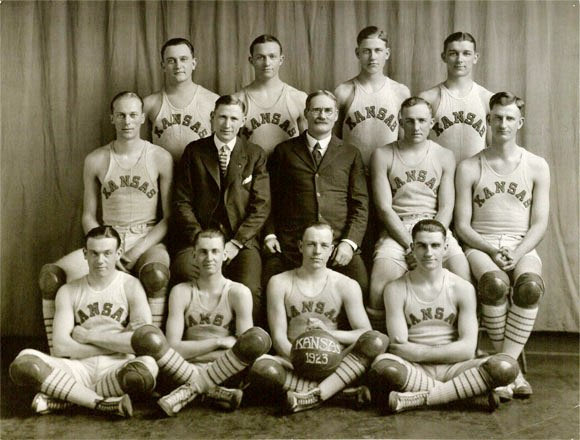 Ο Νέισμιθ (στη μέση της μεσαίας σειράς) με την ομάδα μπάσκετ του Πανεπιστημίου του Κάνσας (1923)