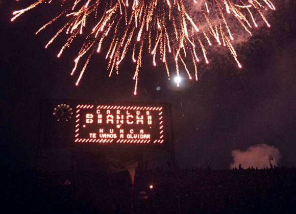 Ο φωτεινός πίνακας του γηπέδου “Χοσέ Αμαλφιτάνι”, έδρας της Βέλες Σάρσφιλντ, γράφει: “Κάρλος Μπιάνκι, δεν θα σε ξεχάσουμε ποτέ!” (στο αποχαιρετιστήριο παιχνίδι του Μπιάνκι ως προπονητή της Βέλες, το 1996)