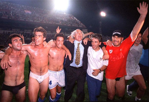 Ο Κάρλος Μπιάνκι πανηγυρίζει μαζί με τους παίκτες της Βέλες την κατάκτηση του Διηπειρωτικού Κυπέλλου (1994)