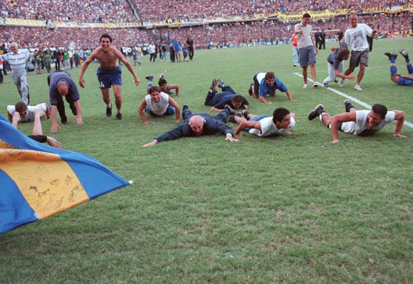 Οι παίκτες της Μπόκα πανηγυρίζουν τη νίκη τους απέναντι στη Ρεάλ Μαδρίτης και ο εκδηλωτικός Μπιάνκι ξαπλώνει πρώτος στο χορτάρι! (2000)