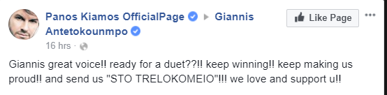 Ο Έλληνας τραγουδιστής είδε το video και πρότεινε στον σταρ των Μιλγουόκι Μπακς να κάνουν ένα ντουέτο! ” Γιάννη έχεις ωραία φωνή! Έτοιμος για ντουέτο; Συνέχισε να νικάς! Συνέχισε να μας κάνεις υπερήφανους! Στείλε μας “ΣΤΟ ΤΡΕΛΟΚΟΜΕΙΟ” Σε αγαπάμε και σε στηρίζουμε“, αναφέρει το σχετικό post.