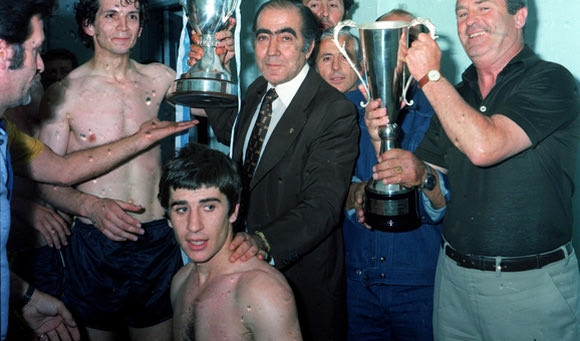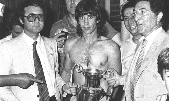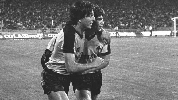 Ο Θωμάς Μαύρος αγκαλιά με τον Βαγγέλη Βλάχο στον τελικό του 1983.