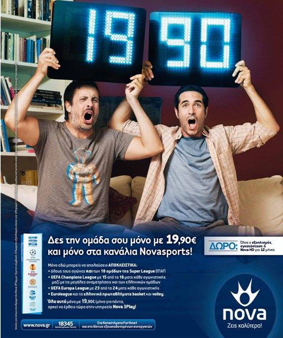 Άμα ακούς κανάλια Novasports, ένα να ξέρεις: θα τα δεις όλα! Μάθε επιπλέον ότι θα δεις όλη τη μπάλα που δεν θες να χάσεις, μόνο με 19,90€!!! Εγγυώνται γι’ αυτό τα κανάλια Novasports! Ότι θα βλέπεις την ομαδα σου, μαζί με όλους τους αγώνες του ελληνικού πρωταθλήματος, καθώς και τα μεγάλα ματς στο Champions League και το Europa League και όλους τους εντός έδρας αγώνες της AEK στη Football League 2.! Mαζί τα μεγάλα μπασκετικά ραντεβού της Euroleague, τα σπουδαία ματς της basket league και αθλητικά γεγονότα από όλο τον κόσμο! Και όλα αυτά, με δώρο την εγκατάσταση και τον αποκωδικοποιητή και επιπλέον, δωρεάν Nova HD για 12 μήνες! 19,90€ ακούς;! Ή κόλλησες στα κανάλια Novasports; Γρήγορα σ’ ένα Κατάστημα Forthnet ή κάλεσε στο 18345 με αστική χρέωση ανά λεπτό… και είσαι έτοιμος!
