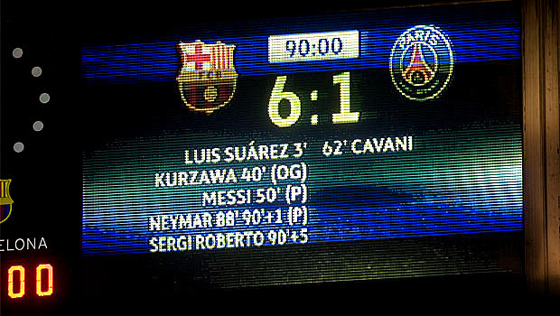 Στην πρώτη φάση των νοκ-άουτ κληρώθηκαν με την Παρί Σεν Ζερμέν και ταξίδεψαν στη Γαλλία για το πρώτο ματς, το οποίο διεξήχθη στις 14 Φεβρουαρίου 2017 στο “Παρκ ντε Πρενς”. Το παιχνίδι αποδείχτηκε παράσταση για ένα ρόλο, με την Μπάρσα να γίνεται έρμαιο στις διαθέσεις των γηπεδούχων, οι οποίοι προηγήθηκαν στο 18′ με τον Ντι Μαρία, διπλασίασαν τα τέρματά τους στο 40′ με τον Ντράξλερ και πέτυχαν ακόμα δυο γκολ στην επανάληψη, ένα με τον Ντι Μαρία στο 55′ και ένα με τον Καβάνι στο 72′, τη στιγμή που οι Καταλανοί είχαν σε όλο το παιχνίδι μόνο μια τελική προσπάθεια εντός εστίας! Το 4-0 δεν άφηνε κανένα ρεαλιστικό περιθώριο ανατροπής, αφού ποτέ στο παρελθόν, σε καμία ευρωπαϊκή διοργάνωση, καμία ομάδα δεν είχε “επιστρέψει” από ήττα με 4-0 σε πρώτο αγώνα.
