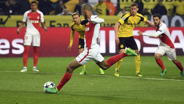 Monaco's Fabinho fails to score a penalty goal during the Champions League quarterfinal first leg soccer match between Borussia Dortmund and AS Monaco in Dortmund, Germany, Wednesday, April 12, 2017. (Federico Gambarini/dpa via AP)