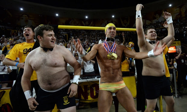 Τώρα ο παίκτης του Oregon State είδε τον Μάικλ Φελπς μαζί με άλλους δύο να ξεπετάγονται πίσω από την κουρτίνα και να χορεύουν, ενώ στη συνέχεια έμειναν μόνο με τα μαγιό τους με τον Φελπς να έχει περασμένα στο λαιμό του όλα τα μετάλλια του.