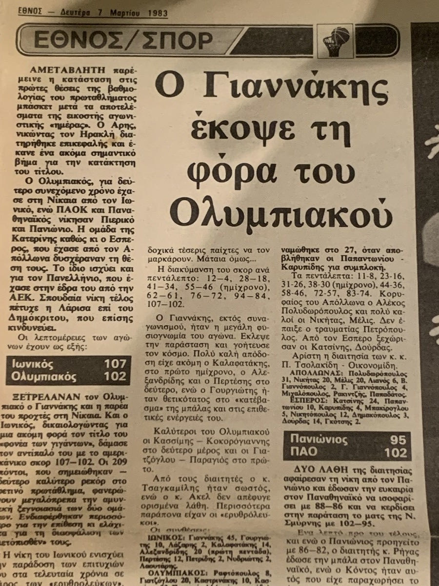 Η λήξη του πρώτου ημιχρόνου βρήκε τον Ιωνικό να προηγείται με 44-42 και όταν οι δυο ομάδες ξαναγύρισαν στο γήπεδο, ο Γιαννάκης απαλλαγμένος πια από το άγχος, άρχισε να οργιάζει και να είναι ο εαυτός του, απέναντι στον Τάκη Κορωναίο που είχε αναλάβει το μαρκάρισμα του.