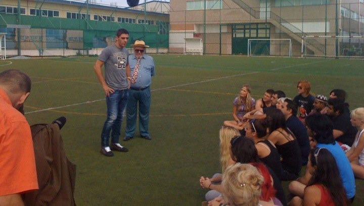 Ο Κώστας Κατσουράνης στο πλευρό του σπουδαίου Έλληνα ηθοποιού Κώστα Βουτσά διδάσκει τα μυστικά του ποδοσφαίρου σε νεαρούς μαθητές.