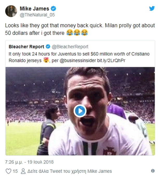 Ο Μάικ Τζέιμς σχολίασε το ποσό που εξασφάλισε η Γιουβέντους μέσα από τις φανέλες του Κριστιάνο Ρονάλντο με το αντίστοιχο της Αρμάνι Μιλάνο για τη δική του μεταγραφή.