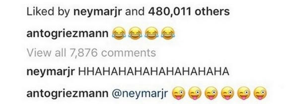 Μία από αυτές του Νεϊμάρ. Ο Βραζιλιάνος της Μπαρτσελόνα σχολίασε κάτω από την εικόνα με παρατεταμένο γέλιο, κάτι όμως που δεν έδειξε να πειράζει καθόλου τον Γκριεζμάν…