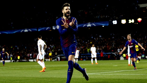 Barcelona's Gerard Pique celebrates after scoring the third goal of his team during a Champions League quarter-final, first leg soccer match between FC Barcelona and Roma at the Camp Nou stadium in Barcelona, Spain, Wednesday, April 4, 2018.(AP Photo/ Manu Fernandez)