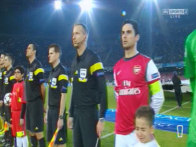 Το μπολ-μπόι που κρατούσε το χέρι του Μίκελ Αρτέτα δεν μπόρεσε να σταματήσει να κλαίει από τα αποδυτήρια και μέχρι να ακουστεί ύμνος στον αγωνιστικό χώρο.