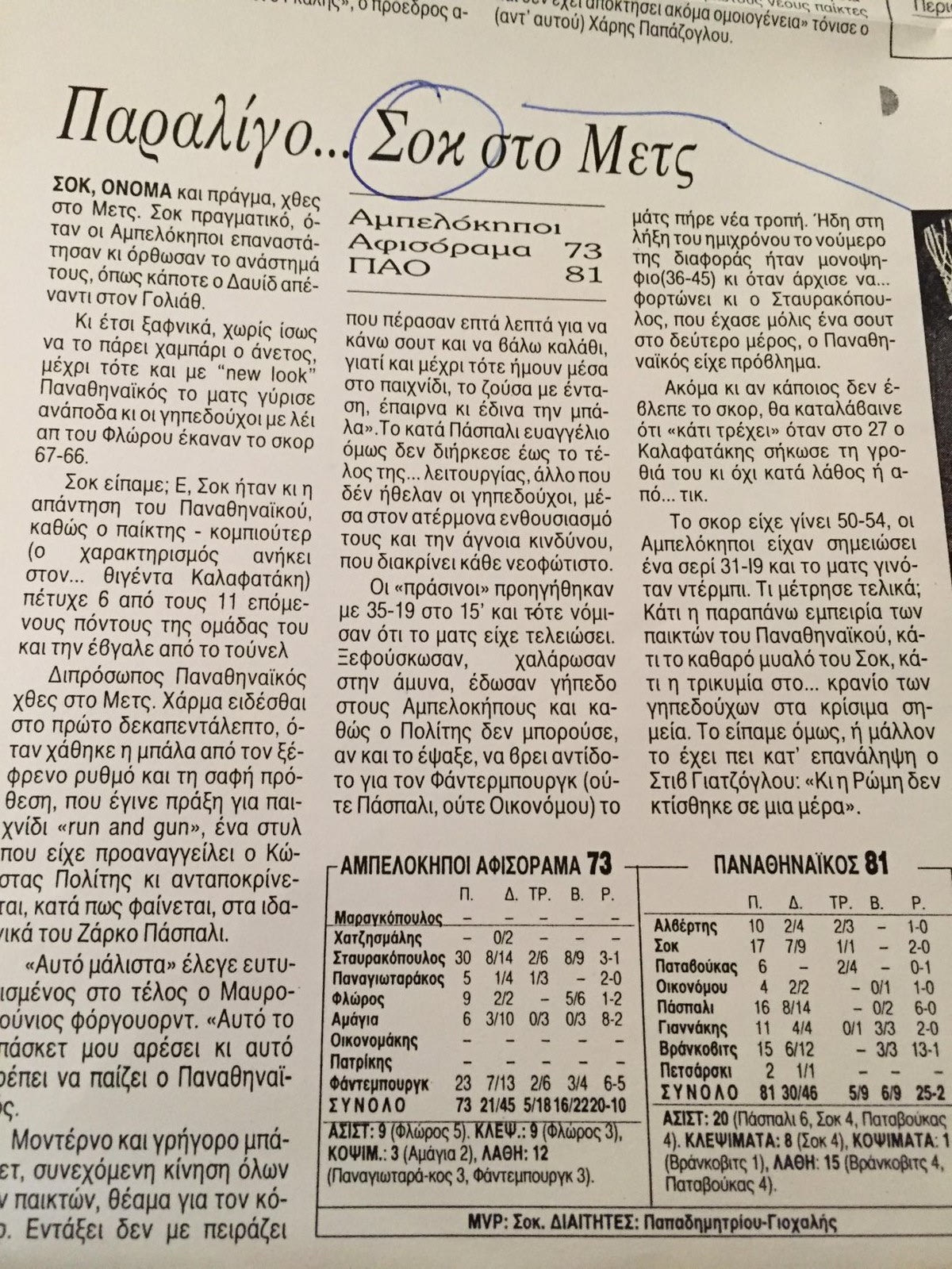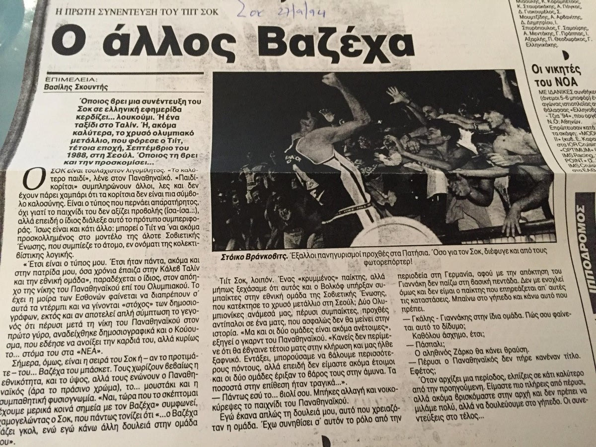Είχαμε πει πολλά και διάφορα με τον Σοκ, ο οποίος και στα τέσσερα χρόνια της καριέρας του στον Παναθηναϊκό αισθανόταν άβολα, διότι δεν κατάφερε να παίξει ποτέ στο Κύπελλο Πρωταθλητριών και συν τοις άλλοις υπήρξε (όπως και ο έτερος Καππαδόκης, ο συμπατριώτης του Αιβαρ Κούουσμα) θεατής στο θριαμβευτικό Final Four του 1996 στο Παρίσι.