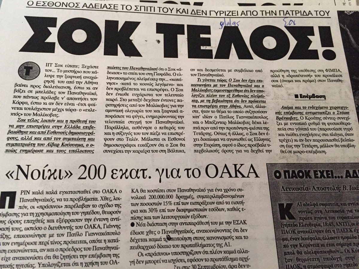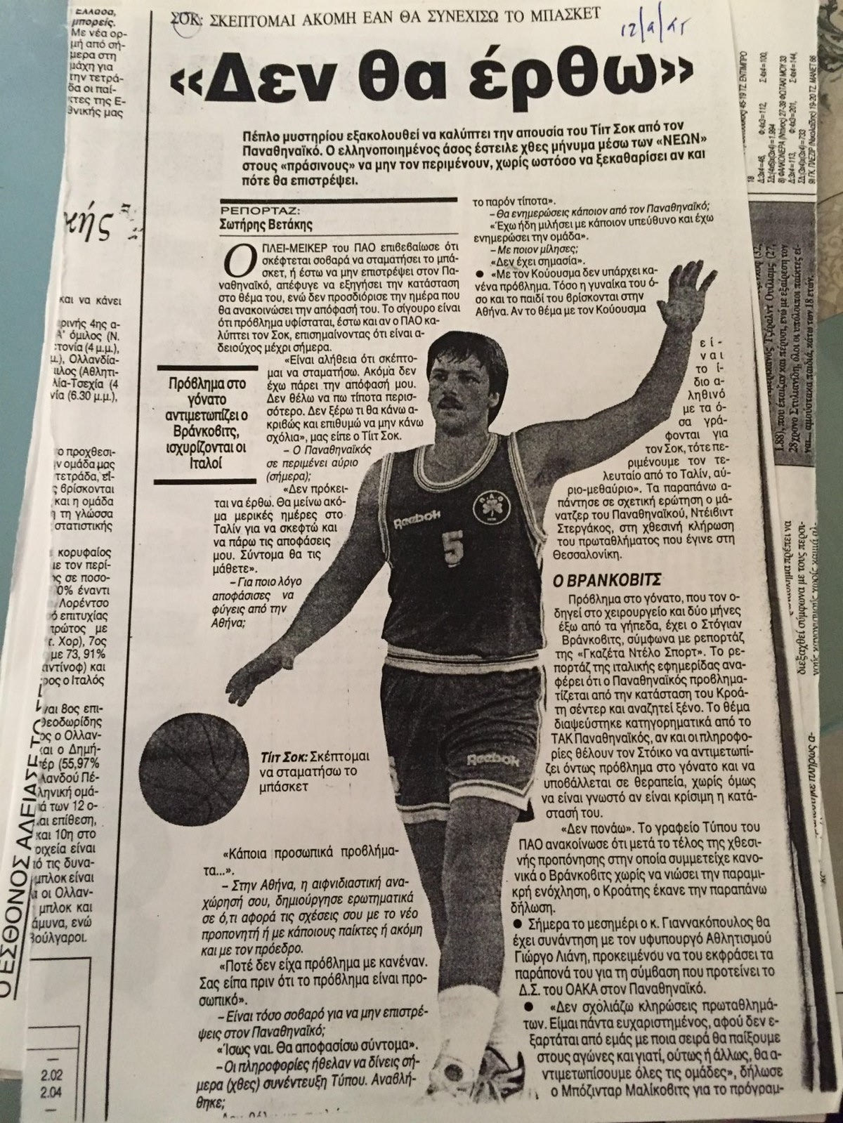 Για την ακρίβεια ο Σοκ δραπέτευσε και πάλι (αλλά αυτή τη φορά δεν ξαναγύρισε) στις 12 Ιανουαρίου του 1998, κάνοντας έξαλλο τον συμπαίκτη του και στον Παναθηναϊκό και στον Αρη, Ζάρκο Πάσπαλι: «Όλοι είμαστε απλήρωτοι και μάλιστα εμένα μου χρωστάνε πολύ περισσότερα λεφτά απ’ ό,τι στον Σοκ, αλλά μένουμε για να πολεμήσουμε. Αυτός έφυγε χωρίς καν να μας αποχαιρετήσει».