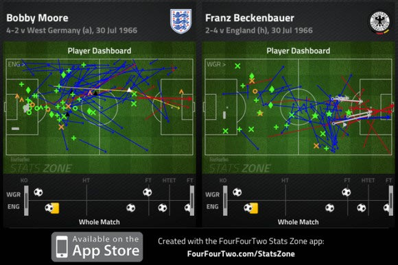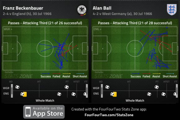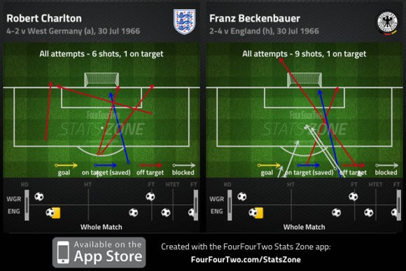 Τόσο ο Μπεκενμπάουερ όσο και ο Τσάρλτον ήταν άστοχοι έχοντας χαμηλά ποσοστά στην προσπάθεια τους να βάλουν γκολ. Ο Τσάρλτον είχε έξι σουτ και μόλις ένα πήγε προς στην εστία και ο Μπεκενμπάουερ είχε ένα σουτ προς την εστία σε 9 προσπάθειες.