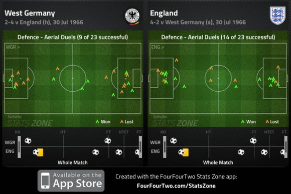 Η Αγγλία ήταν καλύτερη από την Δ. Γερμανία στο ψηλό παιχνίδι καθώς κέρδισε τις 14 από τις 23 εναέριες μονομαχίες.