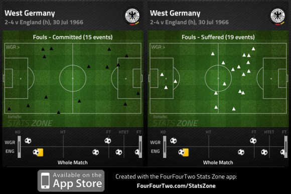 Οι Άγγλοι έκανα τα περισσότερα φάουλ από το κέντρο και προς την περιοχή τους σε αντίθεση με τους Γερμανούς που έκαναν φάουλ σε όλο το μήκος και το πλάτος του γηπέδου.