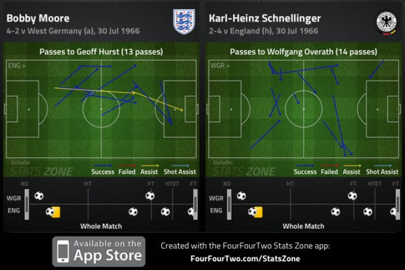 Ο Μπόμπι Μουρ με τον Τζεφ Χαρστ άλλαξαν 13 φορές την μπάλα μεταξύ τους, τις περισσότερες από κάθε άλλο δίδυμο παικτών. Ο Μπουρ έδωσε 2 ασίστ στον Χαρστ, που σημείωσε τρία γκολ στον τελικό. Το πιο συνηθισμένο δίδυμο εναλλαγής πασών στην Δ. Γερμανία ήταν ο Σέλινγκερ με τον Όβερατ με 14 πάσες.