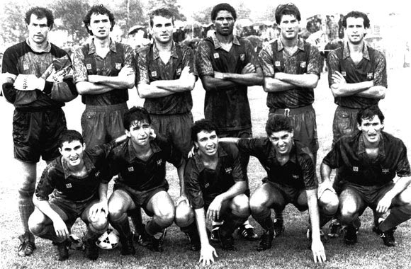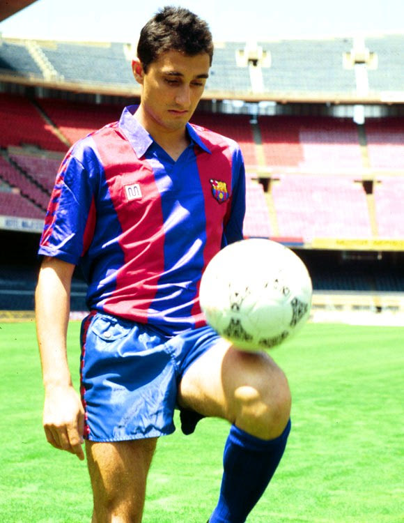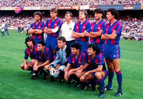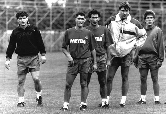 Τα νέα αποκτήματα της Μπαρτσελόνα το καλοκαίρι του 1988. Πίσω, από αριστερά: Λουίς Λόπεθ Ρεκάρτε, Χούλιο Σαλίνας, Γιόχαν Κρόιφ, Μικέλ Σολέρ, Μανόλο Ιέρο, Ρικάρδο Σέρνα. Μπροστά, από αριστερά: Χοσέ Μάρι Μπακέρο, Ερνέστο Βαλβέρδε, Χουάν Κάρλος Ουνθουέ, Εουσέμπιο Σακριστάν, Τσίκι Μπεγκιριστάιν
