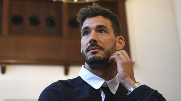 Dortmund player and eye witness Roman Buerki sits in the court room in Dortmund, Germany, Wednesday, April 25, 2018 in the trial against Sergej W., no family name given due to German privacy laws, who is charged with detonating three bombs targeting the Borussia Dortmund soccer team bus last April. (Ina Fassbender/Pool Photo via AP)