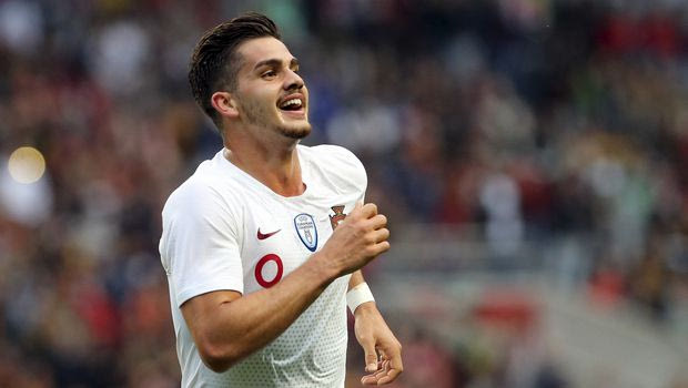 Portugal's Andre Silva celebrates after scoring the opening goal during a friendly soccer match between Portugal and Tunisia in Braga, Portugal, Monday, May 28, 2018. (AP Photo/Armando Franca)